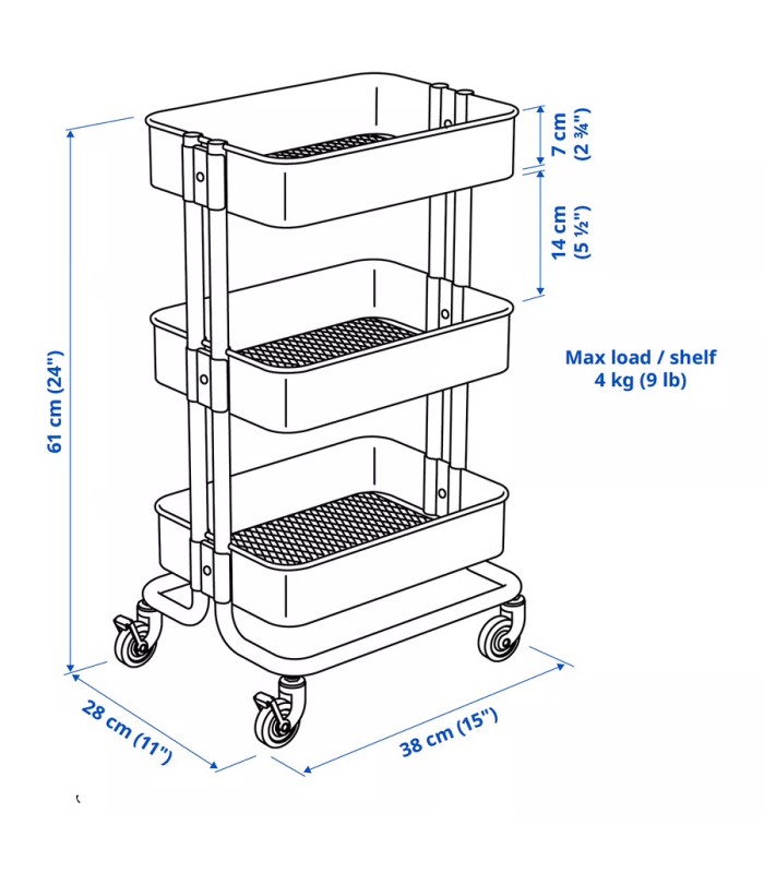 RÅSKOG در دو اندازه مختلف عرضه میشود و این مدل خاص با ابعاد طول ۲۸ سانتیمتر، عرض ۳۸ سانتیمتر و ارتفاع ۶۱ سانتیمتر طراحی شده تا بهراحتی زیر میزها، میز کار یا حتی گوشههای باریک آشپزخانه قرار گیرد.