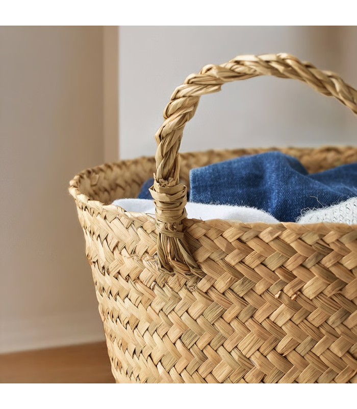این سبد از علف دریایی طبیعی (Sedge) ساخته شده و با روکش لاک شفاف (Clear lacquer) پوشش داده شده تا دوام و ماندگاری بیشتری داشته باشد. علف دریایی مادهای تجدیدپذیر و دوستدار محیط زیست است که به خانه شما حس طبیعت و آرامش میبخشد.