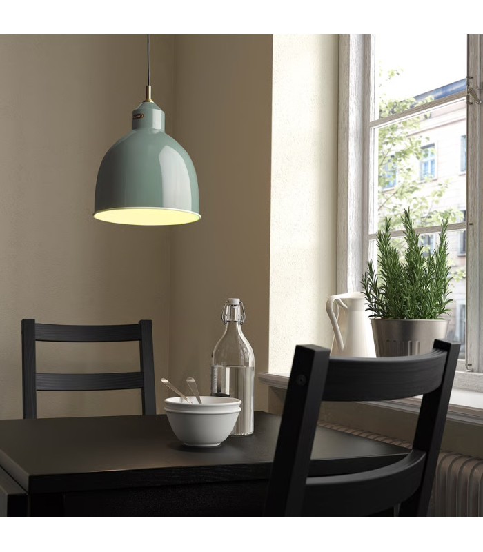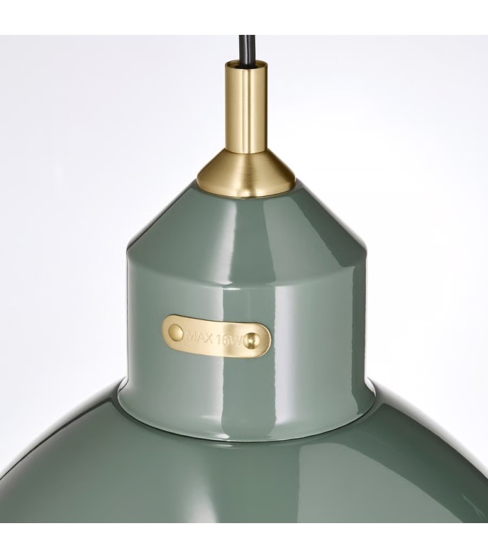 ایکیا در ساخت این محصول از فولاد مقاوم با پوشش پودری و رنگ لعابی براق استفاده کرده است تا علاوه بر زیبایی، دوام بالایی نیز ارائه کند. قطر شید ۲۸ سانتیمتر است و کابل ۱.۸ متری امکان نصب آن در ارتفاعهای مختلف را فراهم میکند. این چراغ با لامپ E27 سازگار است و برند ایکیا استفاده از لامپ LED سفید اوپال را برای ایجاد نور نرم و یکنواخت توصیه میکند. استفاده از جزئیات برنجیرنگ و کلید ضامن برنجی حس لوکس و متفاوتی به این محصول بخشیده است.