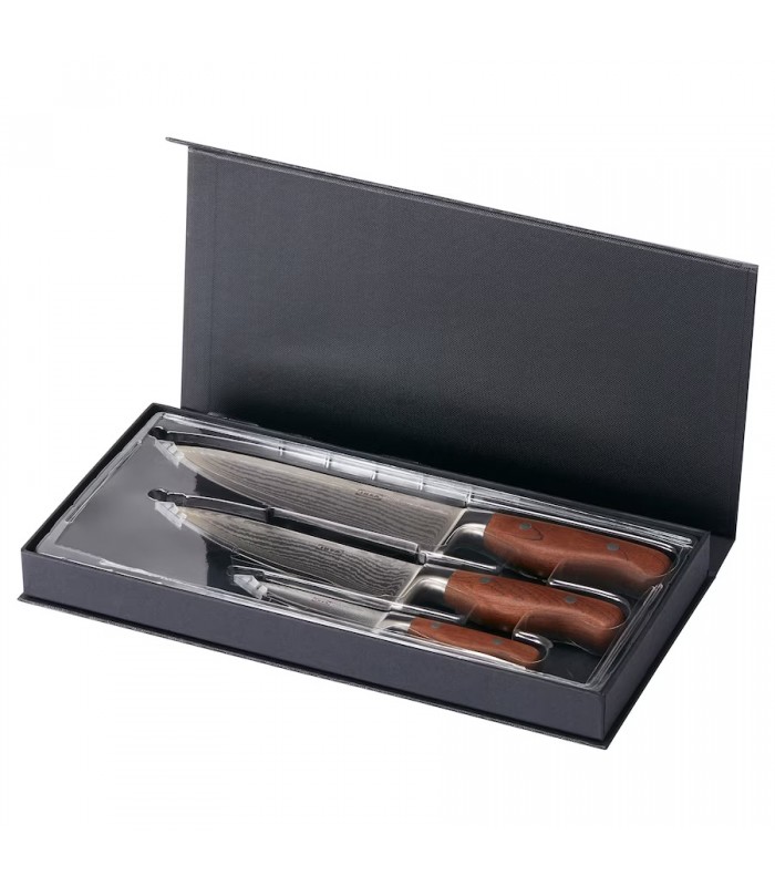 شامل چاقوی آشپزی 20 سانتی متری (طول 32 سانتی متری)، چاقوی آشپزی 16 سانتی متری (طول کل 29 سانتی متر) و چاقوی برش 9 سانتی متری (طول کلی 18 سانتی متر) است.